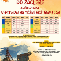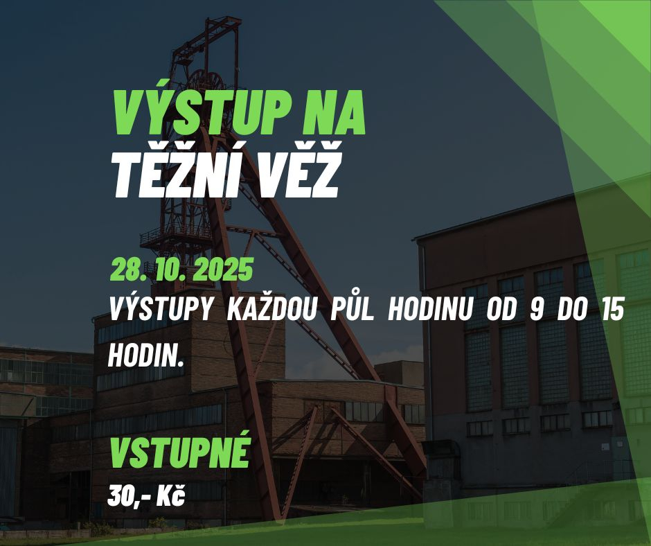 I letos se bude 28. 10. konat tradiční výstup na těžní věž jámy Jan v rámci akce Den věží a rozhleden. Výstupy budou probíhat každou půl hodinu v době od 9:00 do 15:00 hodin. Vstupné 30,- Kč. Upozorňujeme, že do areálu je vstup možný pouze s průvodcem!